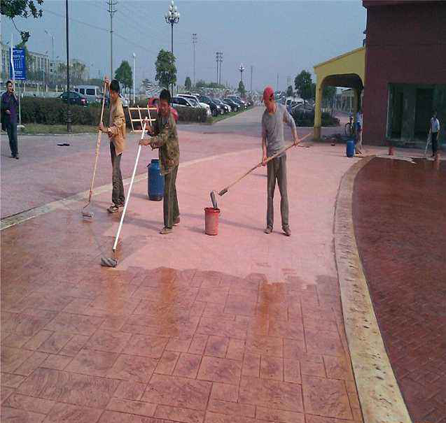 混凝土初凝前,以鏝刀將混凝土鏝平,以撒布法將彩色印花料按規(guī)定用量平均分 二至三次均勻撒布于混凝土面層,每次均勻以專(zhuān)用鏝刀進(jìn)行鏝平、鏝光工作。