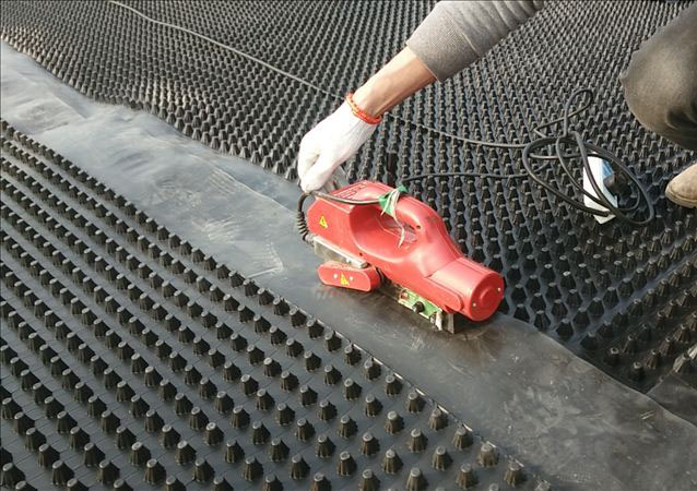 排水板直接在已經(jīng)完工的防水層或混凝土保護(hù)層上鋪設(shè),板材的長(zhǎng)短邊拼接采取搭接方式;聚酯無(wú)紡布亦采用搭接方式,長(zhǎng)短邊搭接長(zhǎng)度各為50~100mm。